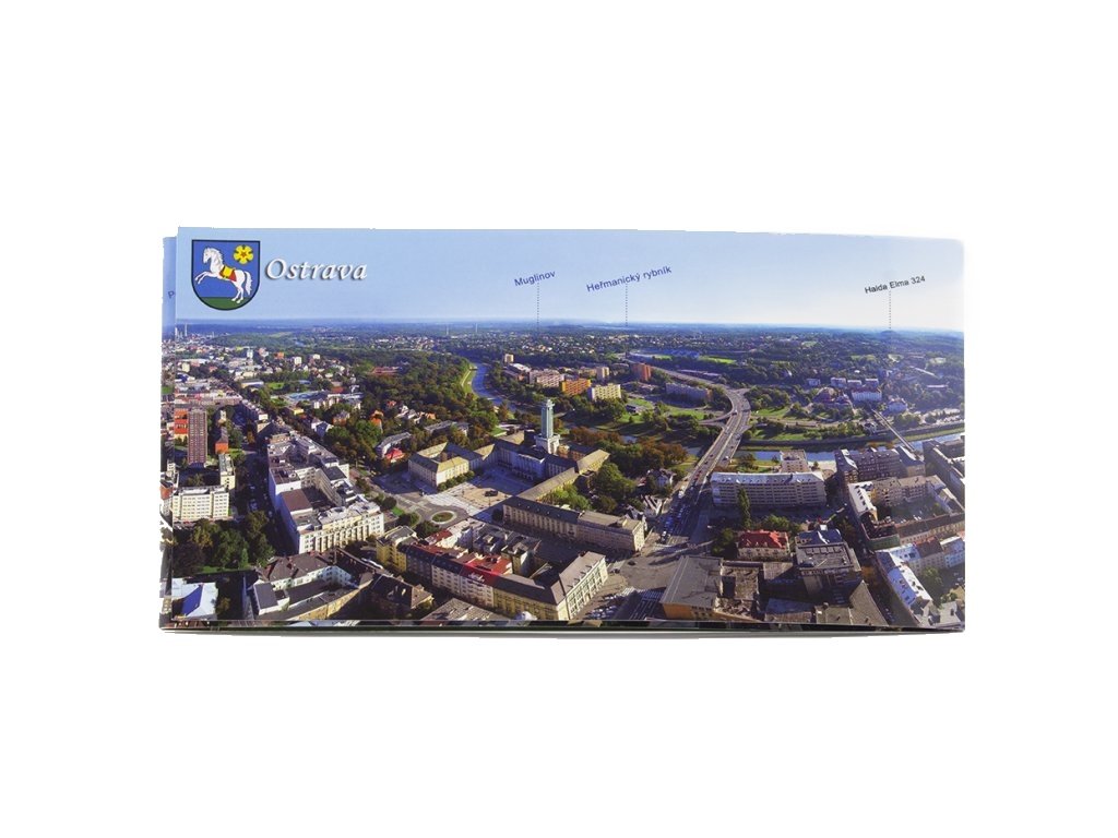 Panoramatická fotografie centra Ostravy s popisky významných částí města a vrcholů Beskyd vč. jejich výšek.